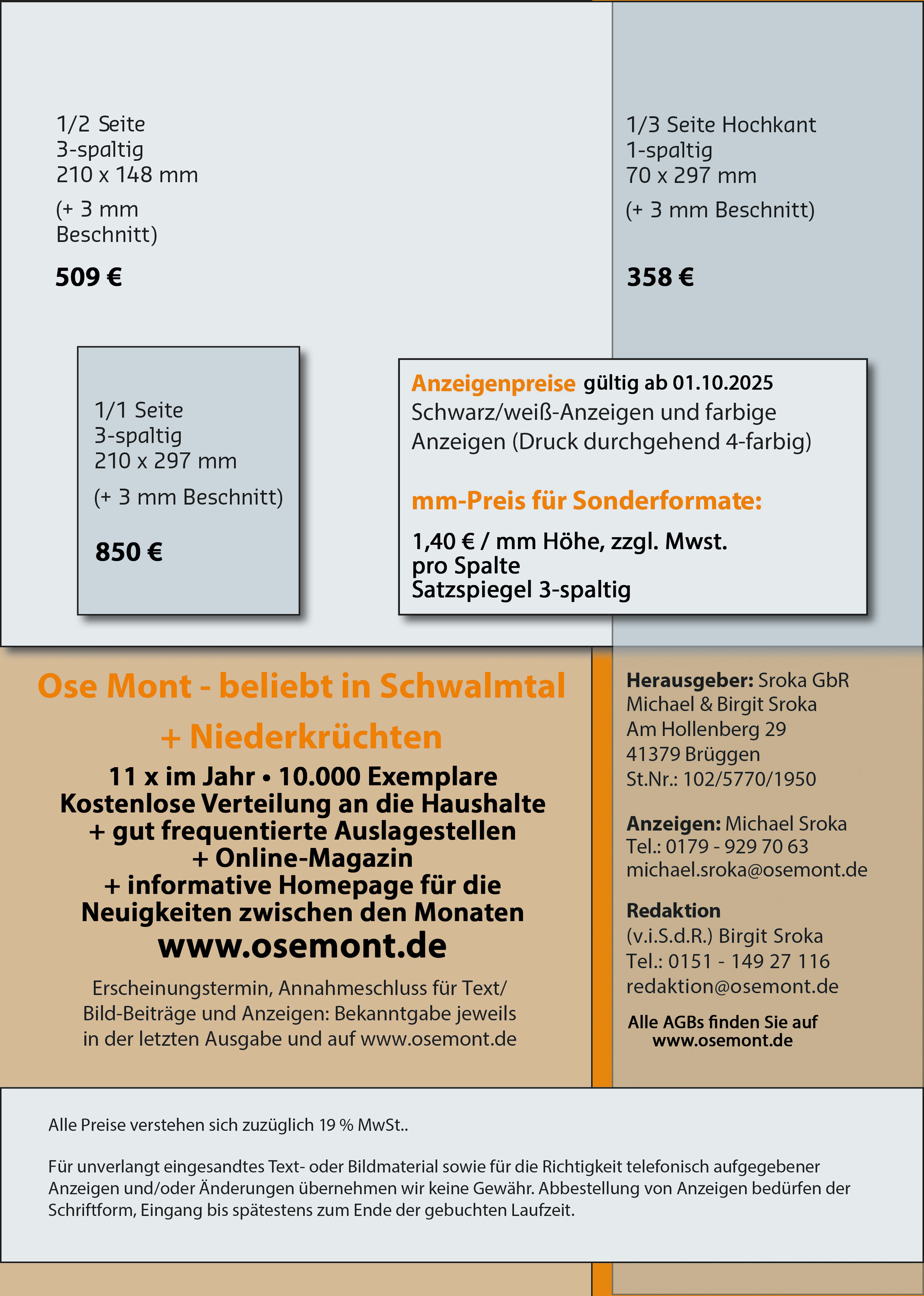 Hier finden Sie unsere Mediadaten für beide Magazine. Ose Mont in orange, darunter Brüggen in blau.